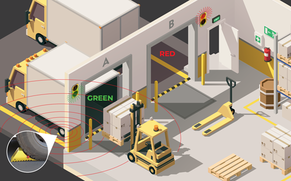 Fabricado pela Solan e distribuído pela Docksteel no Brasil, o equipamento combina calço de roda eletrônico, semáforos de LED e alarmes sonoros para garantir que nenhum caminhão se mova enquanto há empilhadeiras trabalhando na carroceria.